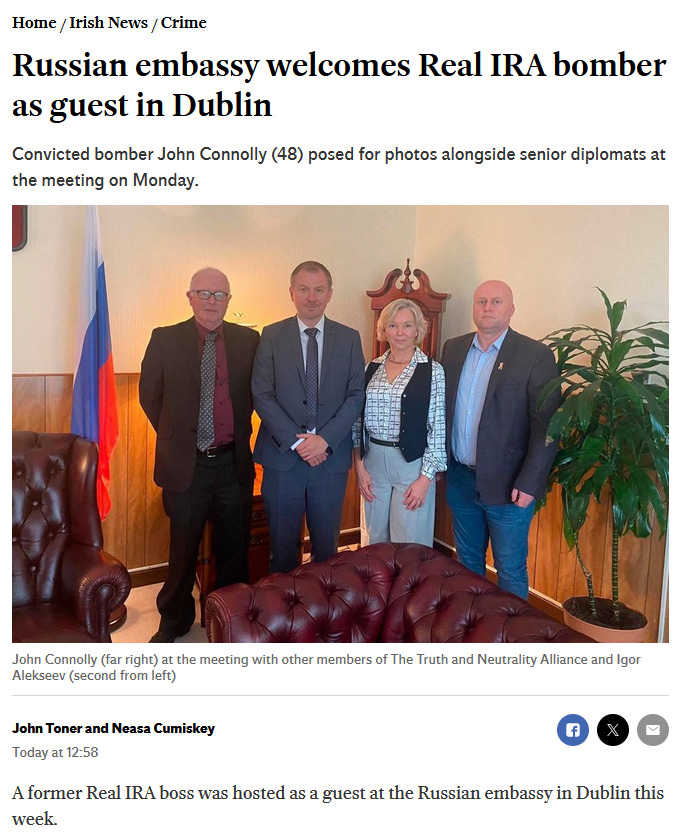 ambasada Rusiei din Dublin l-a invitat pe un fost membru IRA, specialist in bombe artizanale la o intalnire in care sa mai depene si ei amintiri. Sunt sanse mari sa fie amintiri comune pentru ca URSS a ajutat IRA in rezistenta armata impotriva UK-ului timp de zeci de ani. Si probabil ca ar face-o si pe viitor daca va fi cazul. La fel cum si UK-ul ii sprijina activ cu arme, bani, know-how pe adversarii Rusiei.