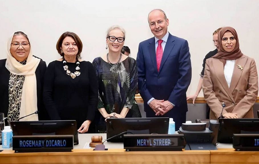 Tanaiste Micheal Martin s-a intalnit cu Meryl Streep sa discute despre femeile din Afganistan. Nu mi-e clar in ce fel o actrita oarecare in pragul pensiei sau vice-prim-ministrul unei tari minore din nordul Europei ar putea influenta viata femeilor din Afganistan (n-au influentat-o nici cei douazeci de ani de ocupatie militara americana) dar o discutie n-a omorat pe nimeni.