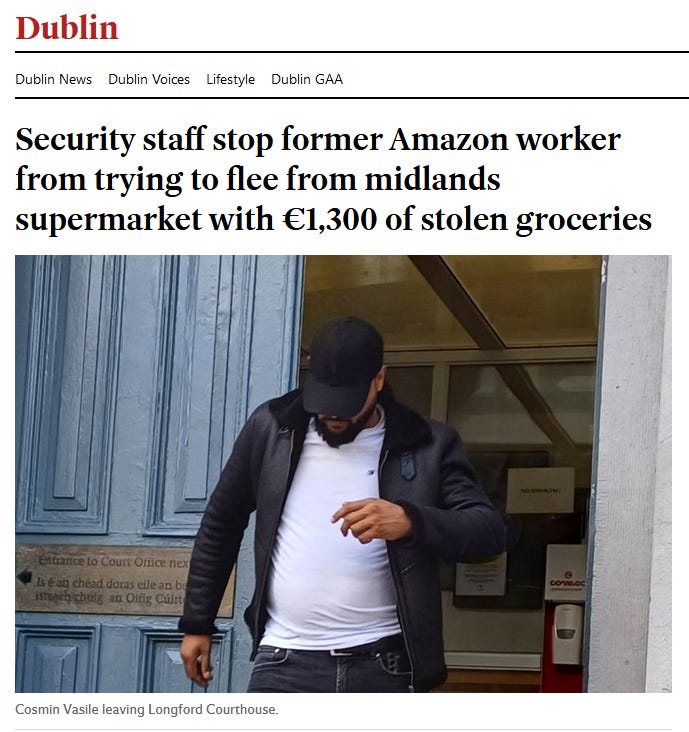 presa irlandeza titreaza ca un domn numit Cosmin Vasile a incercat sa plece dintr-un magazin cu marfa in valoare de 1.300 de euro fara sa o plateasca, fara succes insa.