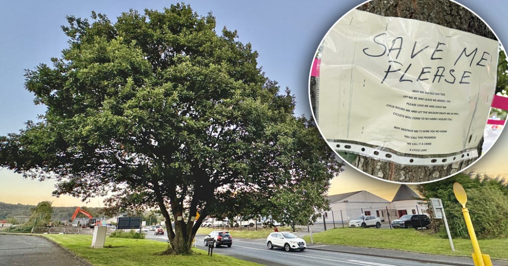in Letterkenny localnicii se lupta sa salveze un stejar de 90 ani care sta in calea progresului. Mai precis sta in calea progresului biciclistilor, pentru ca s-ar dori extinderea unei piste de biciclete pe acolo.