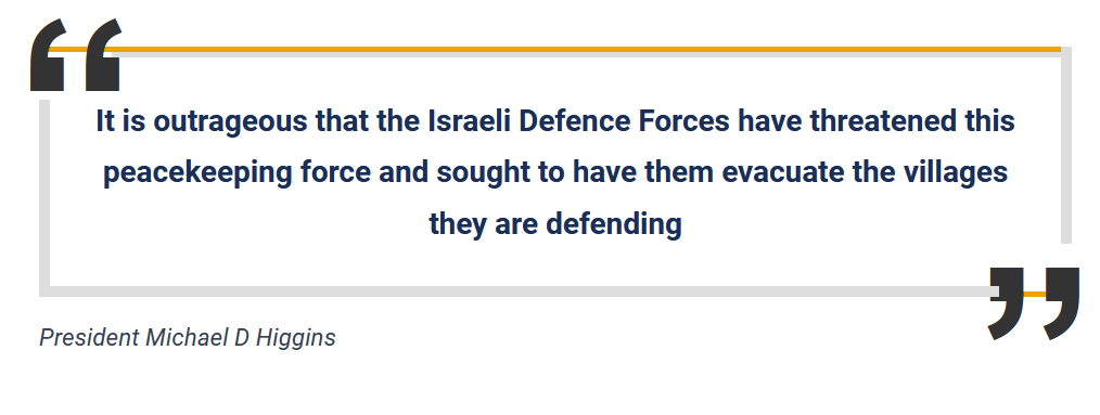 presedintele Higgins este de parere ca amenintarile proferate de armata israeliana la adresa trupelor irlandeze de mentinere a pacii din Liban sunt inacceptabile si sunt o insulta.