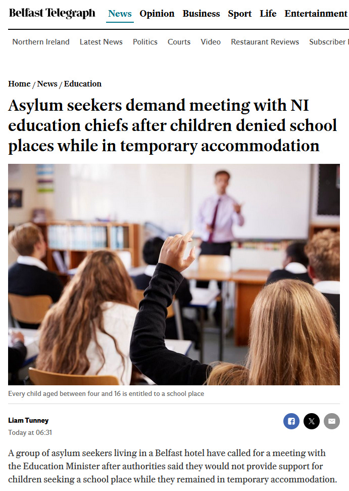 Un grup de azilanti care traiesc intr-unul din hotelurile din Belfast au organizat un comitet care sa exprime ingrijorarea lor cum ca autoritatile nord-irlandeze nu fac mai mult pentru integrarea copiilor lor in sistemul public de invatamant. Adica locuri speciale pentru ei & shit. Si vor sa negocieze cu autoritatile ca acestea sa faca mai mult pentru ei.