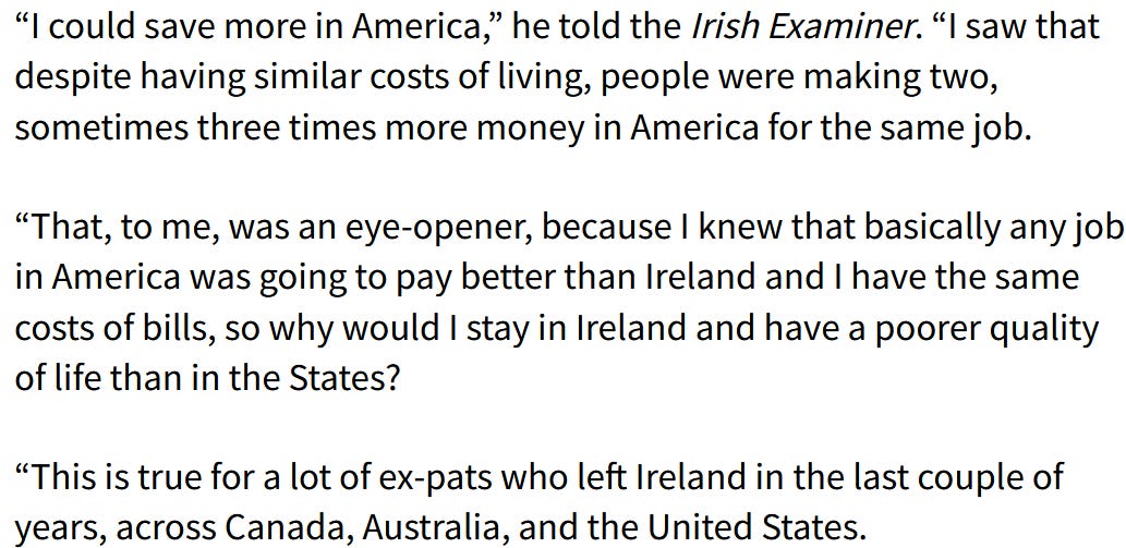 Sigur, nu toti irlandezii sunt barmani, nu toti au 22 de ani, nu toti au salarii entry-level insa o tara condusa inteligent ar trebui sa faca in asa fel incat sa fie atractiva pentru tineri. Tinerii proprii adica, nu doar cei din Africa, pentru care e atractiva orice alta tara decat a lor.