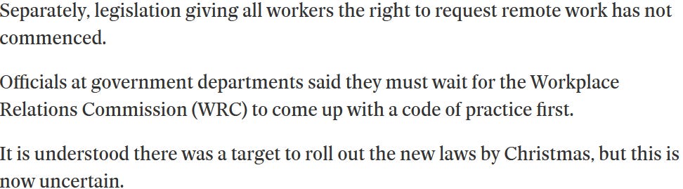 Angajatii din Irlanda care muncesc de acasa sunt chemati din nou la birouri, in timp ce legea promisa din timpul pandemiei de politicieni, lege care ar fi trebuit sa ii protejeze de presiunile angajatorilor si sa le permita posibilitatea de a opta in continuare pentru munca de acasa se lasa asteptata.