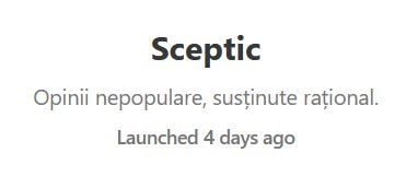 Cel mai recent intrat pe lista mea de substackeri este un sceptic. Adica asa se numeste autorul, Sceptic, nu stiu cat de sceptic e in viata reala. Probabil ca o sa imi spuneti ca includerea pe lista la doar patru zile de la lansare e un pariu riscant, si nu va pot contrazice.
