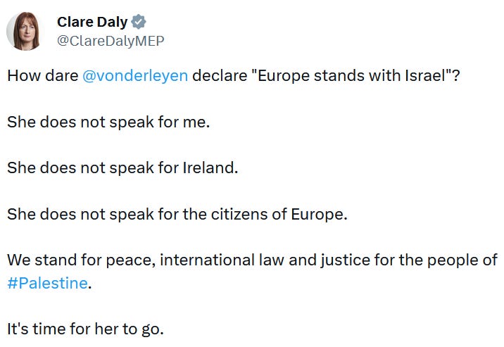 Clare Daly o confrunta pe Ursula, politiciana nealeasa democratic pentru functia pe care o ocupa, ci numita printr-un conclav ocult, mai ocult decat numirea unui Papa sau sef de loja masonica. O politiciana care fara sa fie aleasa de cetatenii europeni isi permite sa vorbeasca in numele lor, sa sustina financiar razboaie in numele lor, sa bage biruri noi in numele lor si in general sa faca cam tot ce cetatenii europeni nu si-ar dori, daca e sa ne uitam pe sondaje.