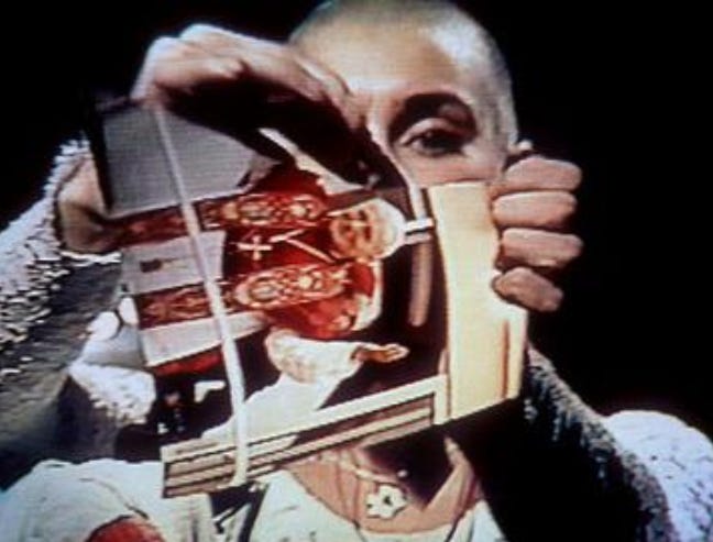 Se declara in public admiratoare a unei organizatii paramilitare intr-o perioada foarte dureroasa pentru irlandezi, reuseste sa isi insulte publicul catolic rupand intr-o emisiune tv o fotografie a Papei, este numita preot intr-o secta nerecunoscuta de Biserica Catolica, incepe o lunga campanie de activism feminist foarte problematica. Campanie care culmineaza cu schimbarea legala a numelui care a facut-o celebra Sinead O’Connor in Magda Davitt, “ca sa se elibereze de sclavia patriarhala“.