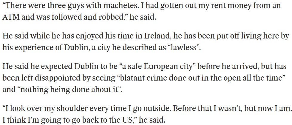 Americanul a spus ca i-a placut orasul Dublin dar pleaca acasa pentru ca Dublin este “lawless“. Ca este lawless stim cu totii, inclusiv doamna ministra a justitiei care ne tot spune ca ea se simte in siguranta pe strazile din Dublin.