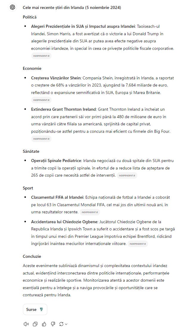 De ceva vreme a aparut in chatGPT-ul meu de toate zilele un icon nou, buton de search. L-am ignorat o vreme, ca eram ocupat cu stirile, cum va povesteam. Azi m-am gandit sa il testez. Si imi zic eu, hai sa incep in mod natural cu stirile irlandeze. Ii zic “coix, ia fa-mi tu o lista cu cele mai importante stiri irlandeze de astazi, impreuna cu un pic de context pentru fiecare stire si baga-le si linkuri. Asa, si pune-le pe categorii”. A durat cateva secunde bune pana l-a generat. Cu titluri, pe categorii, explicatii coerente. Deja incepuse sa ma enerveze. Ii mai zic “ia scrie-l ca articol de ziar in limba romana”. A facut-o si pe asta. Tot cateva secunde. N-arata rau deloc. Sigur ca as putea sa mai polizez promptul dar nu mai aveam chef de asta.