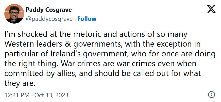 Actul al treilea al acestei povesti irlandeze vine in toamna lui 2023 cand Paddy Cosgrave, fondatorul “Web Summit“ simte nevoia de un pic de virtue signalling si le ia apararea victimelor Israelului. Se intampla si celor mai buni dintre noi.