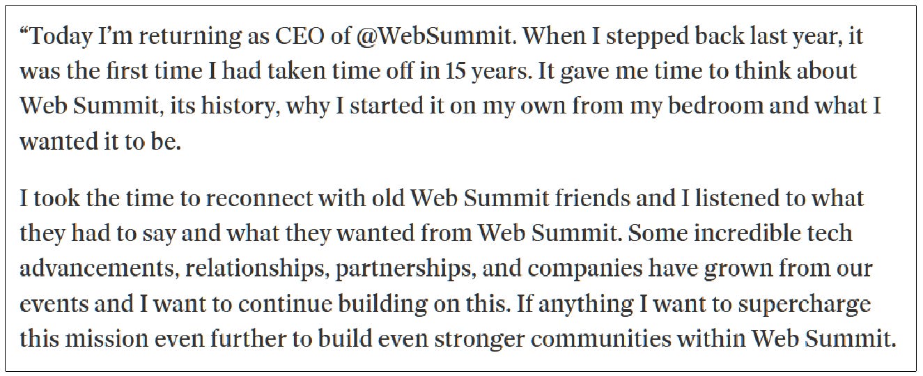Astazi, 8 aprilie 2024, Paddy Cosgrave a anuntat ca revine in functia de CEO al “Web Summit“. Ca actionar majoritar nu a trebuit sa isi negocieze revenirea cu nimeni, a fost o simpla decizie. Irlandezii sunt rezilienti si ambitiosi.